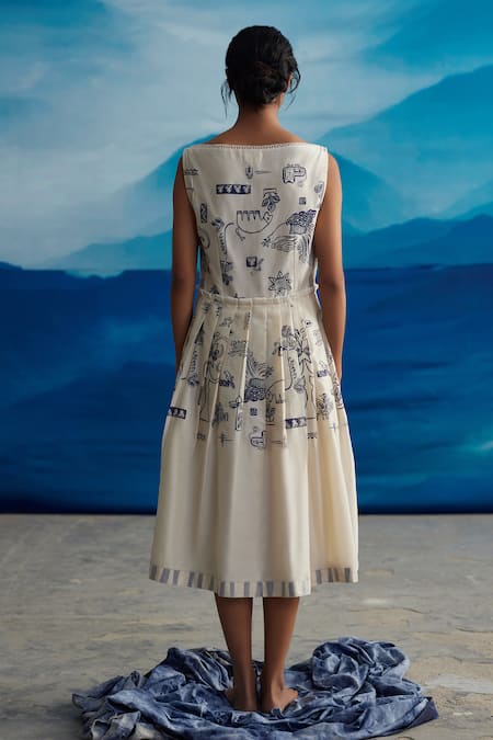 Ivory Chanderi, Cotton Embroidery Boat Neck Pema Knife Pleated Printed Dress
