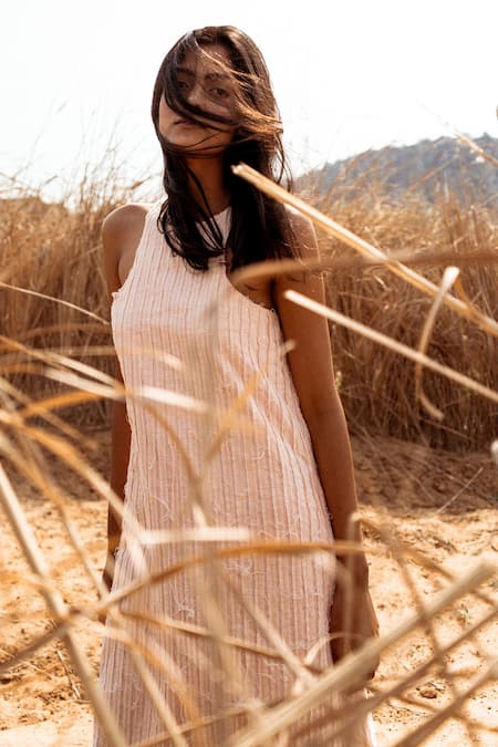 Pink Handloom Cotton Halter Neck Textured Maxi Dress