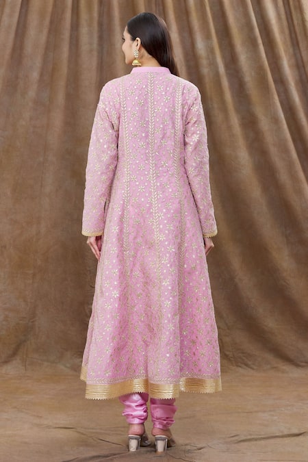 Pink Chanderi anarkali featuring rose gold floral and gota embroidery. Paired with churidar, tassel bordered dupatta, and potli bag.
