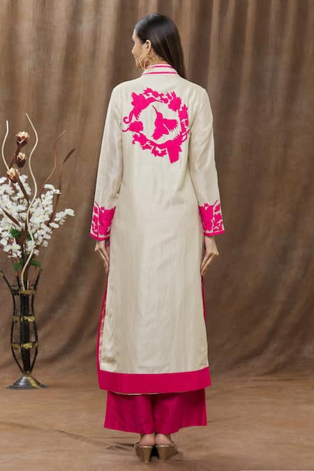 Beige kurta with pink applique work and band collar. Comes with pink straight pants.