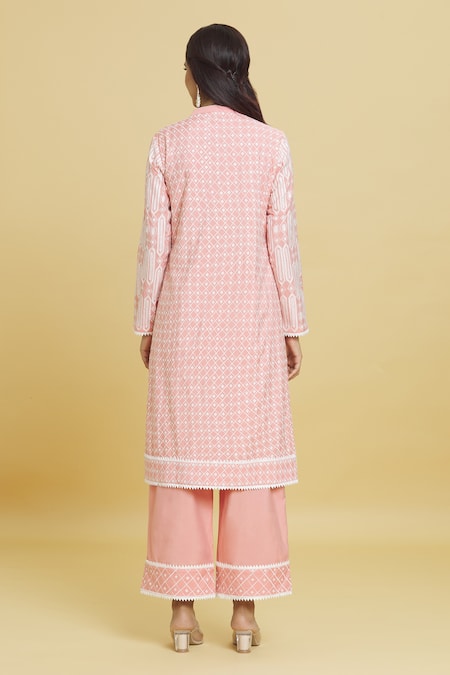Pink Cotton, Silk Lace, Embroidery Mandarin Collar Geometric Kurta Pant Set