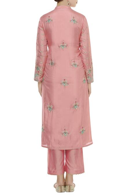 Pink Silk Chanderi Mandarin Collar Embroidered Kurta Set
