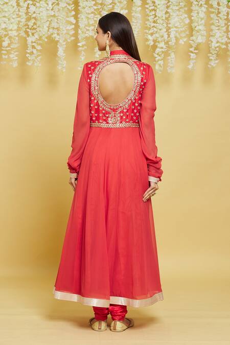 Red Silk Embroidery, Zari, Sequins Mandarin Collar Anarkali Set