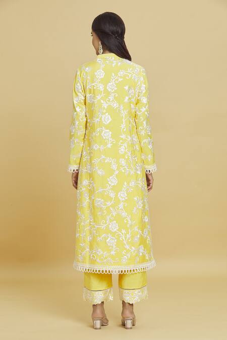 Yellow kurta featuring all-over thread embroidered floral motifs with a mandarin collar and full sleeves. Paired with matching pant and dupatta, both adorned with lace borders.