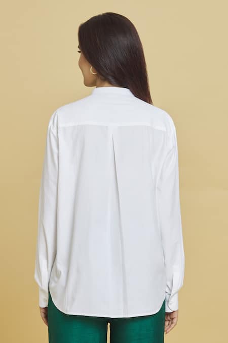 Embroidered venus flytrap motifs on the front, Band collar design, Cuff sleeves for added elegance