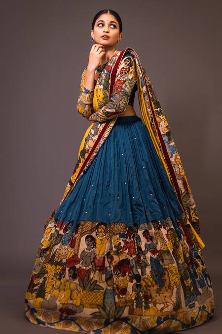Blue lehenga featuring hand painted Kalamkari patterns with human and animal motifs. Paired with a blue blouse adorned with glass beads and a yellow dupatta with contrast borders.