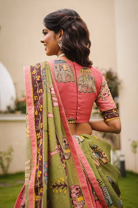 Kalamkari elephant painted lehenga featuring a hand painted blouse and a green dupatta. The lehenga is made from Chennur silk with triangle gota lace borders and an attached inner lining.