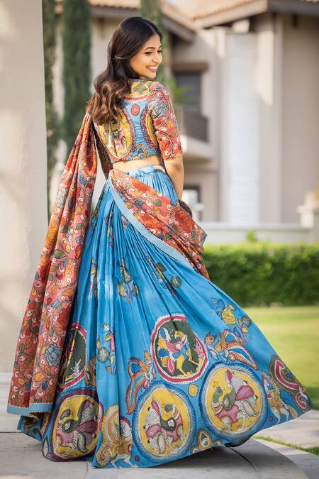 Blue , Chanderi Beads, Embroidery V-neck Kalamkari Lehenga Set