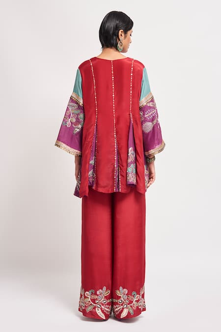 Buy_Aisha Rao_Red Silk Sequins, Embroidery Collared Ayana Embellished Godet Kurta Pant Set