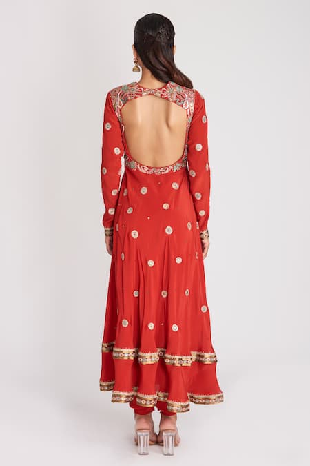 Red mulberry crepe anarkali featuring thread and sequins applique embellishments. Paired with churidar and a dupatta, it has an open back design.