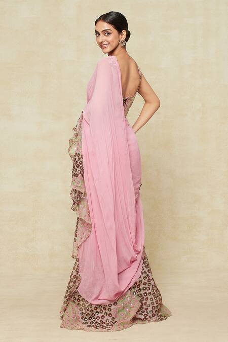 Pink pre-draped saree featuring a geometric embroidered ruffle palla. Comes with a matching embroidered blouse with a scoop neckline and back hooks closure.