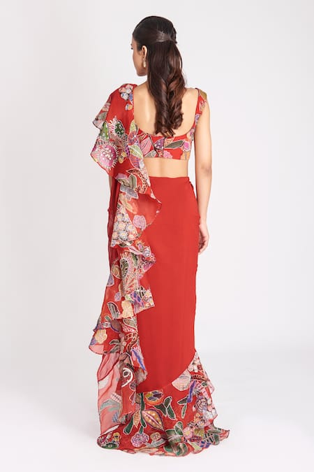 Red Organza, Georgette Floral Print Ruffle Pre-stitched Saree With Blouse