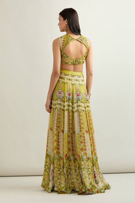 Lime green lehenga featuring floral prints and lurex stripes. Paired with a matching embroidered blouse and dupatta.