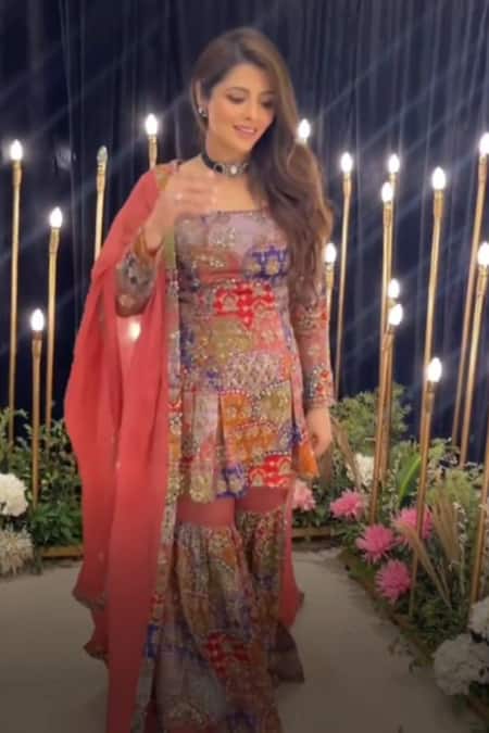 Tropical peach short hem kurta featuring multi color prints with embellished details. Paired with flared sharara & chiffon dupatta.