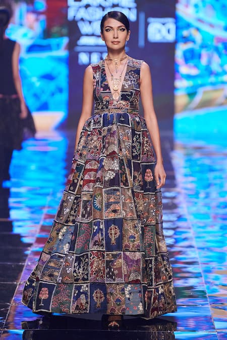 Fit and flare silhouette, Embroidered tree and floral motifs, Blunt V neckline, Note:, The choker and necklace worn by the model is not for sale