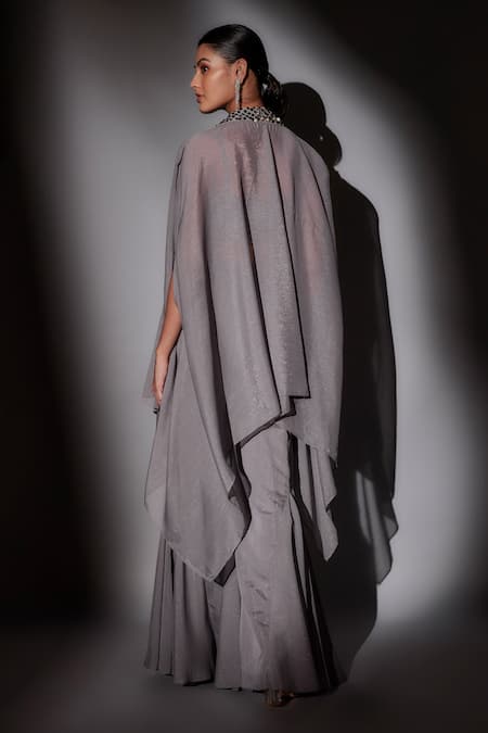 Grey bustier featuring a sweetheart neckline and sleeveless design. Paired with a flared panelled sharara and an open double collar cape adorned with bead and cutdana embroidery.