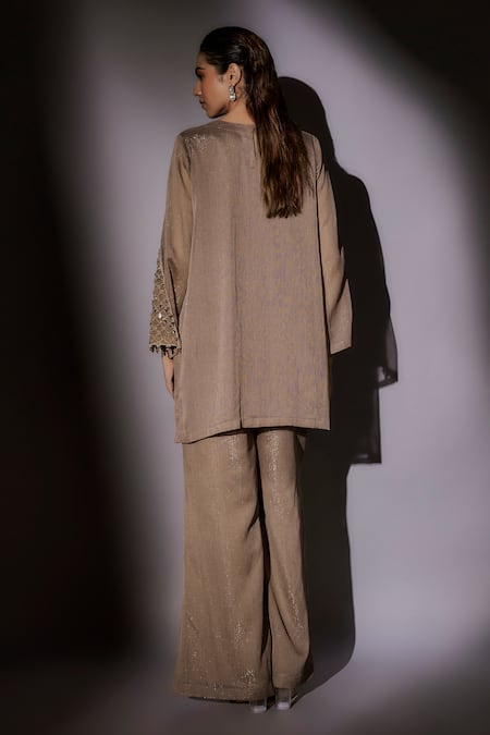 Beige Lurex Crystals, Sequins, Beads Round Neck Embroidered Kurta And Pant Set