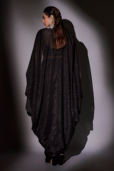 Buy_Ajiesh Oberoi_Black Satin, Lurex Cut Work Square Neck Embroidered Cape Skirt Set _at_Aza_Fashions