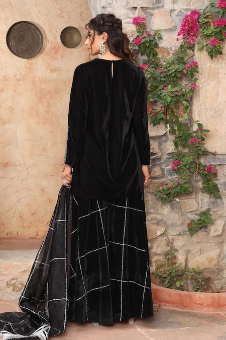 Black velvet kurta featuring triangular embroidery with bead and mirror work on the neckline and full sleeves. Paired with a sharara adorned with lace details and an organza dupatta showcasing sequin and lace work with fringe borders.
