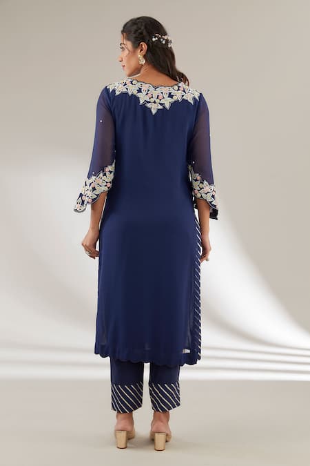 Blue kurta featuring intricate floral embroidery and bell sleeves. Paired with a matching pant and dupatta, both in dupion silk and rayon.