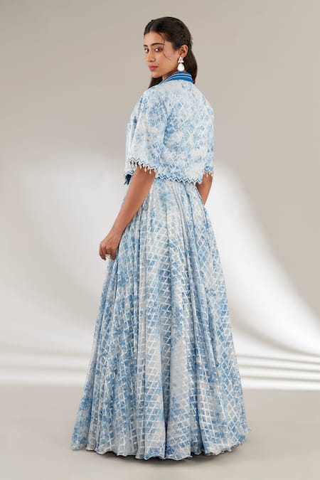 Blue lehenga in a silver checkered patterned base. Comes with a jacket featuring silver checkered patterns, nakshi embroidered leaf motifs on left collar, sequin stripes on the right collar and cut-out hem borders with crystal drops on sleeves. Paired with leaf embroidered padded inner blouse.