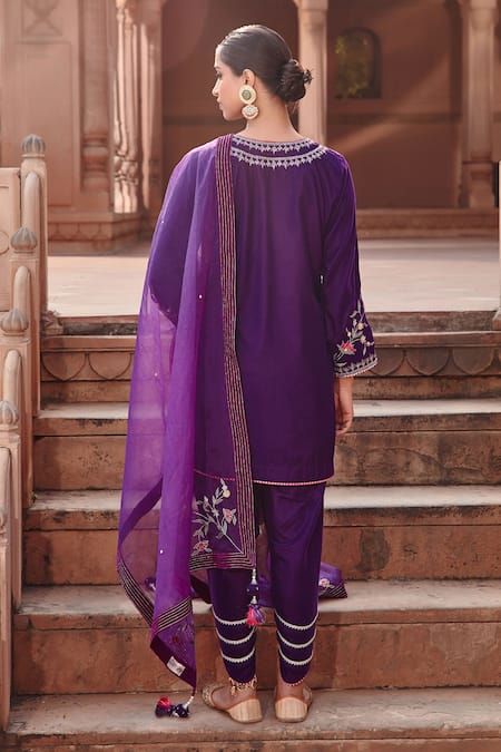 Buy_Ajiesh Oberoi_Purple Organza, Velvet Diamonds, Embroidery Round Neck Dori Short Kurta Set _Online_at_Aza_Fashions