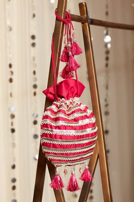 Hot pink potli bag featuring gota patti trims and bead hangings