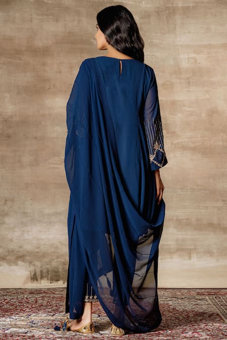 Navy blue short anarkali with bead, cutdana & sequin detail. Comes with tapered pants & dupatta.