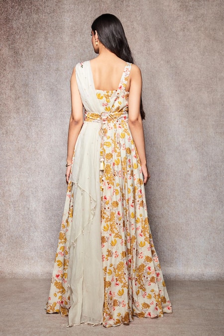 Off white gown with all-over floral embroidery. Paired with drape and belt.