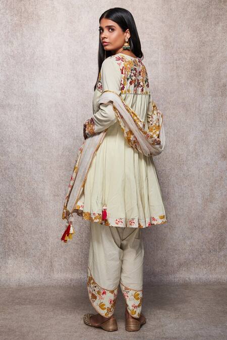 Off white kalidar kurta with floral embroidered yoke and sequin detailing. Paired with dhoti and scallop hem dupatta.