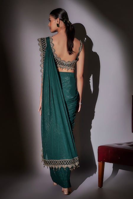 Green pre-draped saree featuring a floral cutwork border. Paired with an embroidered scalloped blouse adorned with tassel details.