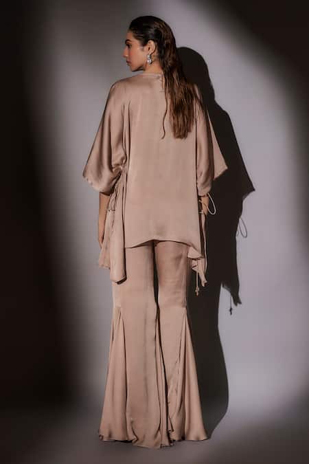 Beige kaftan featuring a round neckline with a drawstring closure and flared sleeves. Paired with a panelled flared sharara, both adorned with mirror, bead, sequin, and cutdana embroidery in a checkered pattern.