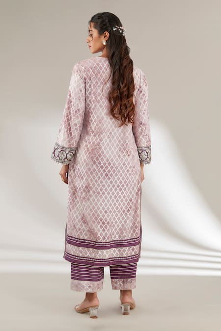 Purple kurta featuring silver nakshi & pearl embroidered floral motifs and silver checkered patterns. Paired with a checkered pattern palazzo and tasselled dupatta with lace border.