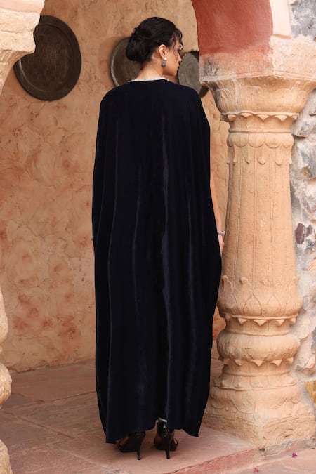 Navy blue velvet kaftan featuring flower embroidery with beads and sequins. Paired with matching pant for a complete look.