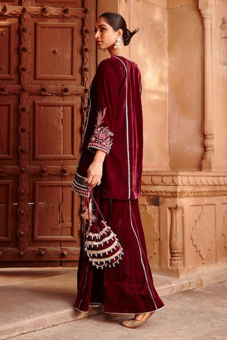 Buy_Ajiesh Oberoi_Wine Velvet, Organza Sequins, Beads Round Neck Short Kurta Gharara Set _at_Aza_Fashions