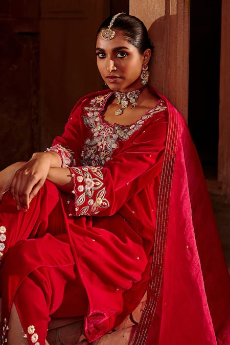 Intricate floral embroidery on kurta and pant, Tassel detailing on dupatta, Cutwork neckline design