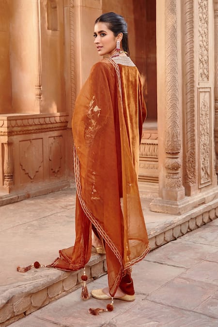 Buy_Ajiesh Oberoi_Gold Velvet, Organza Embroidery, Tassels V-neck Kurta Dhoti Pant Set _Online_at_Aza_Fashions