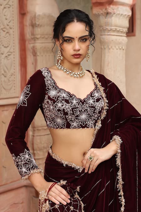 Wine velvet pre-draped sharara saree featuring floral embroidery and sequins embellishments. Paired with a full sleeve blouse adorned with zari work and fringe borders.
