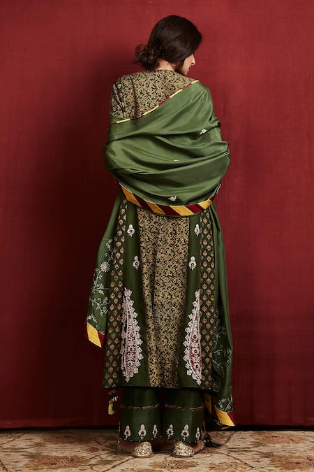 Green kurta with floral embroidered & Ajrakh printed motifs. Paired with embroidered palazzo & silk dupatta.