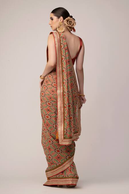 Red, green saree with ajrakh print & embroidered border. Paired with printed blouse.