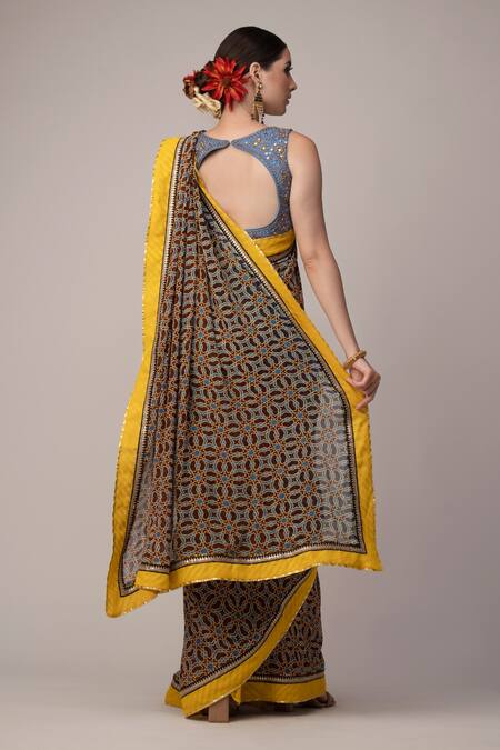 Blue, brown saree with ajrakh print & embroidered border. Paired with embroidered blouse.