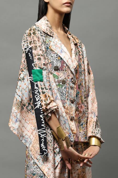Multi color abstract printed jacket featuring a wide notched lapel and long sleeves. Paired with a pleated and draped skirt with an asymmetric hem.