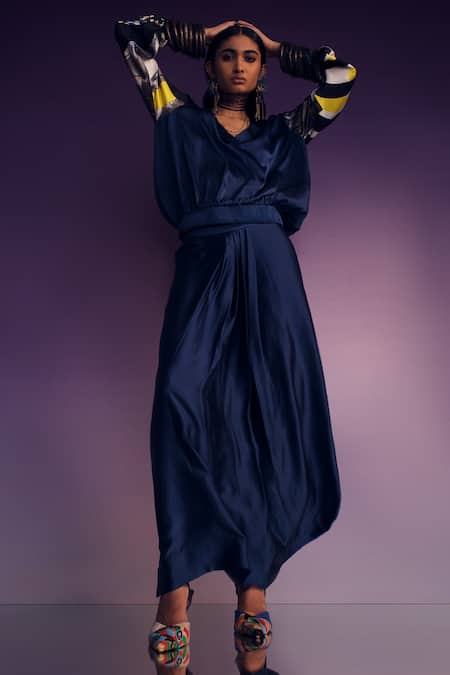 Blue V neck silk crop top featuring abstract print sleeves and a ribbed waistband. Paired with a plain draped skirt with front pleats detailing.