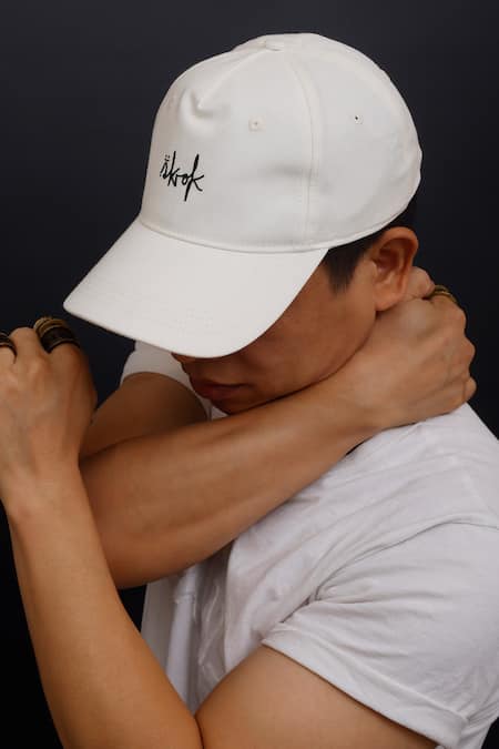AK-OK_White Embroidery Cotton Typographic Print Baseball Cap _Online_at_Aza_Fashions