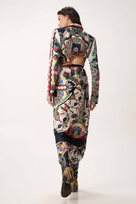 Asymmetric cutwork hem on the jacket, Draped design on the skirt, Bead embellishments throughout the skirt