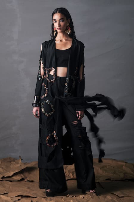 Black jacket featuring metal coin embroidery and cutwork detailing