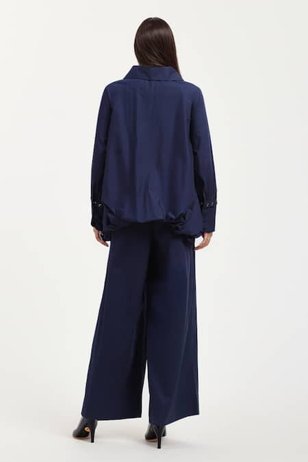 Blue Cotton Embroidery Collared Eyelet Shirt And Trouser Set