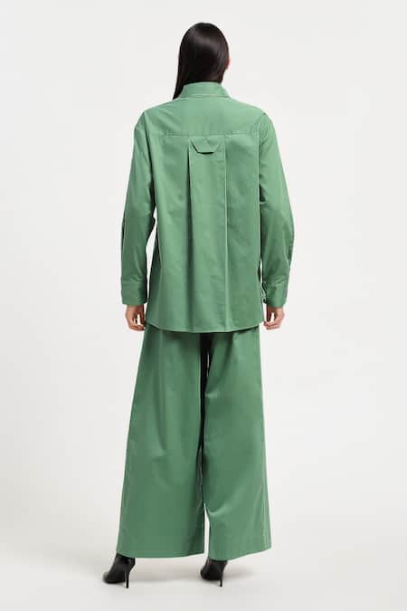 Green shirt featuring eyelet embroidery on the full sleeves and a collar neck. Paired with a matching flared trouser for a coordinated look.