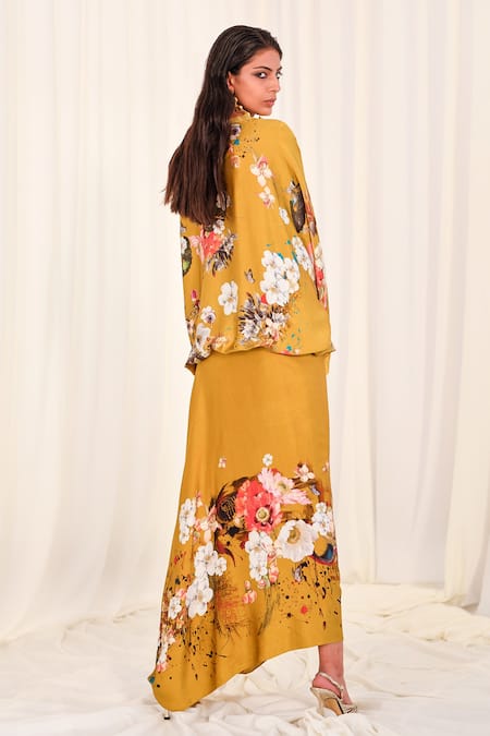 Yellow silk top featuring flared sleeves and round neckline. Paired with an asymmetric drape skirt adorned with floral and ostrich prints.