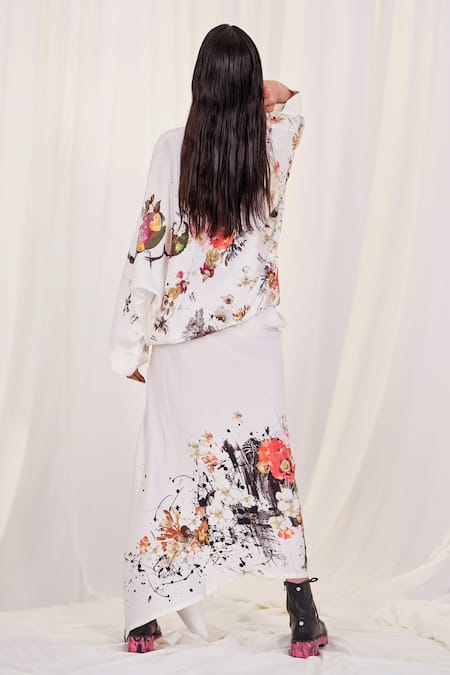 White flared sleeve top featuring contrast ostrich and floral print. Paired with an asymmetric skirt adorned with under water world embroidered motifs and lattice lace detail.